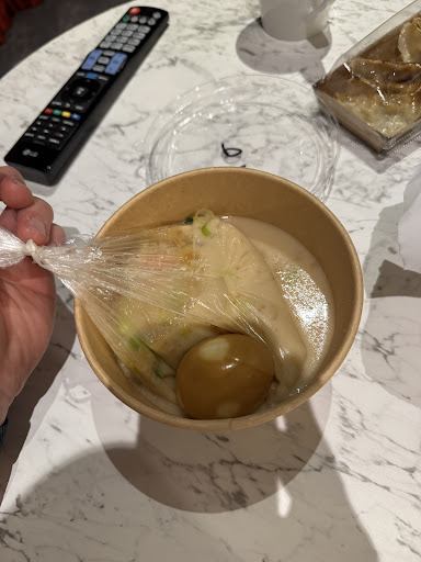 Le lieu en lui même est petit et intimiste. Décoration simpliste mais sans être vide. C'est un beau petit resto dans lequel je me suis sentie à l'aise. Ce soir là, il n'y avait qu'une personne pour faire le service et on ressent que ce restaurant sert le plus souvent des repas en livraison que sur place. L'organisation de la salle est pensée pour, avec un espace dédié pour préparer les sacs. C'est sans doute le point négatif ici, c'est que l'on mange avec une vue sur les sacs qui attendent les livreurs. La personne en salle s'est excusée plusieurs fois pour l'attente. Nous avons attendu un petit temps avant que l'on prenne nos commandes, ils priorisent en effet les commandes en livraison qui, je suppose, doivent être réalisées en un temps donné. Mais j'ai apprécié les excuses et l'honnêteté de cette dame. Nous lui avons bien sûr dit que nous avions le temps et de ne pas trop s'inquiéter pour ça. Nous avons été servis rapidement après notre commande. Des Gyozas en entrées et deux ramens. Sans surprise, le repas était délicieux. Nous nous sommes tous les deux régalés de plats copieux et savoureux. En revanche, petit bémol pour nos boissons qui sont arrivés en milieu de repas, je suppose que la surcharge de commandes n'a pas aidé à resté concentré sur les commandes sur place.