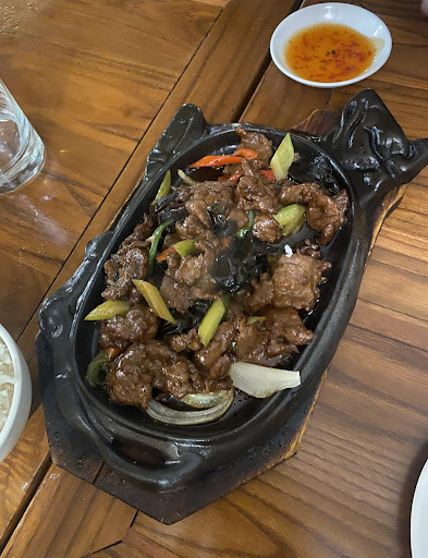 Mon grand classique câest le bĆuf Ă©picĂ© ou poivre suivant les restaurant qui est servis encore crĂ©pitant sur une plaque chauffante avec des oignons et des poivrons, et je nây ai pas dĂ©rogĂ©! Câest un rĂ©gal et tellement copieux. En entrĂ©e, jâai goutĂ© les nems et les raviolis đŠ