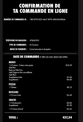 Les pizzas sont arrivées comme prévu, cependant l’employé m’a appelé pour m’informer qu’il n’y avait plus de Coca-Cola en bouteille de 1,25L. J’ai donc opté pour une canette de Coca-Cola cerise et une canette de Coca-Cola normale. Jusque-là, tout allait bien. Le livreur est arrivé, mais un imprévu est survenu : le terminal de paiement ne fonctionnait pas. L’employé, courtois, m’a laissé monter pendant qu’il retournait au restaurant chercher un autre terminal. Entre-temps, il s’est trompé et a ramené une Coca-Cola zéro au lieu d’une normale. J’ai essayé de l’appeler pour qu’il revienne avec la bonne boisson, mais personne n’a répondu. Il est finalement revenu, je lui ai signalé l’erreur et j’ai payé.