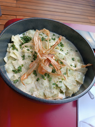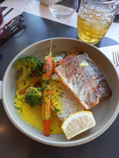 This restaurant leverages modern decor, and is situated in a very modern complex, right next to a Novatel and overlooking one of Lyon's jetties. It offers a large menu, including a delicious selection of tapas, especially the roasted vegetable platter, which was mildly spiced and full of flavor. Attentive service -- remembered everything we asked for. My suggestion: Order the "ceviche de bar" (sea bass), and the eggplant caviar, and the burrata. We came to this restaurant because they have a terrace with a view, and an interior dining room that is air conditioned (heat wave)...and left appreciating the...