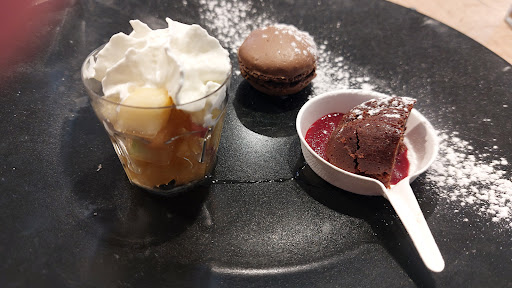 Excellent accueil, et un lieu, cadre très agréable, avec une équipe sympa et dynamique. Cependant, déçue de constater qu'ici, encore une fois, nous sommes loin de dire que dans la restauration française on sait sortir du carcan ancestral de la viande mijotée ou grillée, ou autres poissons, animaux de mer, sans ne jamais oublier beurre, lait, fromage, œuf. Et une connaissance très peu approfondie d'un mot (à la mode), utilisé, à toutes les sauces : "veggie". Mais que proposez-vous alors, pour ceux qui sont "veggie"? Plus intéressant : Que proposeriez vous, peut-être prochainement pour les végétaliens (vegan)? Votre salade poke bowl, était bonne ef si je ne me trompe pas elle était vegan. Par contre ,ensuite risotto de.... j'ai pas su déterminer, avec une espèce de chantilly.... au parmesan ? Ce dernier ingrédient est un POA et même le risotto y avait de la crème, j'ai quasiment senti que ça. Quant aux desserts, visuellement très beaux ces petites verrines, mais même la simple salade de fruits était recouverte de chantilly de lait. En 2023, vous n'êtes peut-être pas encore prêts pour prévoir pour ces alternatives alimentaires où beaucoup de monde s'orientent , davantage dans les autres pays que la France,c'est vrai mais nous ne sommes clairement pas en avance sur ce sujet ,alors que...