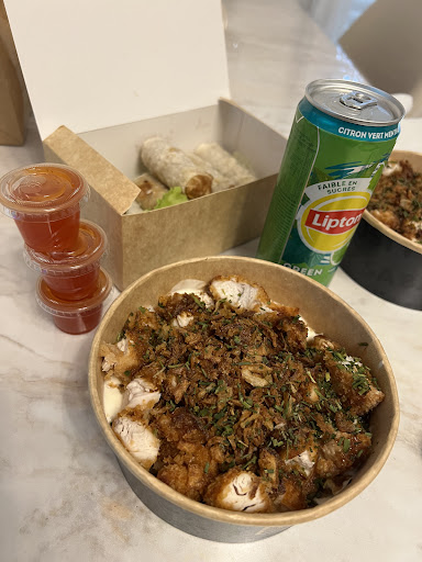 Ils nous font croire à une promo "1 acheté = 1 offert" pour 20€ et nous prennent pour des idiots... À quel moment un bol de riz-poulet a-t il déjà coûté 20€ de base dans une vie ??? Ce n'est pas une promo, c'est juste pour inciter les gens à se persuadé que "ah bah ça va, ça revient à seulement 10€ le bowl"... NON EN FAIT !! Ne vous faites pas avoir, c'est juste pour vous faire acheter 2 fois un bowl qui coûte déjà 10€ dans sa normalité. Ils se font une marge beaucoup trop indécente en comptant sur la crédulité des consommateurs. Ce n'est pas honnête de faire des promo déguisées sans scrupule et sans aucune sanction. Un vraie promo ça aurait été "1 bowl acheté = 1 bowl offert pour 10€". Là ça aurait vallu le coût sur Ubereat. Franchement décevant.