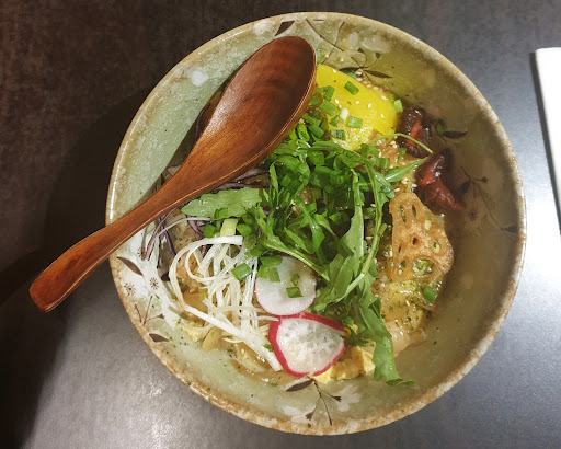Nous avons pris ensemble des Gyoza, Karaage, et un ramen curry et ramen au poulet. Les Gyoza sont végétariens (j'ai peut-être mal commandé ou mal lu, pas un grand fan...) Le Karaage est honnête, plutôt bon, la salade à côté était fraiche Ramen Curry, sans le piment, le bouillant manquait de saveur, oeuf un peu froid en son coeur, les algues prennent vites le dessus sur tout le reste si on les laisse (même la viande) Même constat sur le ramen de ma compagne, bouillon assez fade Je pense qu'un peu plus de saveur dans le bouillon et avec un peu plus de viande, cela aurait été parfait.