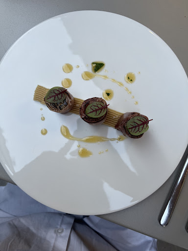 Cet endroit est un enchantement ! Table de six personnes, nous étions installés depuis 15mn en terrasse quand on a décidé qu’on aurait peut-être moins chaud à l’intérieur. Pas de soucis, table installée en salle 3 minutes après. Un intérieur plein de douceur, avec vue directe sur le chef qui s’applique sur chaque assiette (finition à la pincette !) Apéritif, mise en bouche et c’est parti pour une succession de plats en 7 services. Et là, c’est un ravissement à tous les niveaux : chaque assiette est un petit chef-d’œuvre esthétique et gustatif. Le chef décrit ses plats complexes et intelligents avec simplicité et modestie. Ingrédients responsables et durables, associations de goûts audacieuses mais toujours équilibrées : les réseaux sociaux du restaurant ne nous avaient pas menti ! Des vins en parfaite adéquation avec les plats (avec le chef qui taquine même mes amis connaisseurs en leur apportant ses bouteilles coups de cœur à l’aveugle).