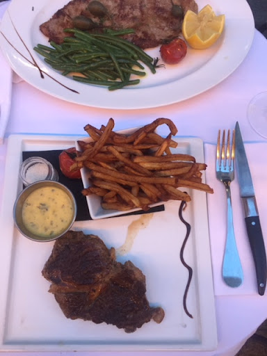 The starters are priced at âŹ15.90 and the main dishes are âŹ24.90. The latter are split in meat, fish and vegetarian dishes. The fish included salmon steak and roasted cod but we opted for the meat. We had an Entrecote black Angus with bĂ©arnaise sauce and French fries and a Veal escalope with fresh green beans Unfortunately my steak with a little tough and overdone. However, the bĂ©arnaise and thin fries were fantastic! We were impressed with the veal which was a large portion and very tender.