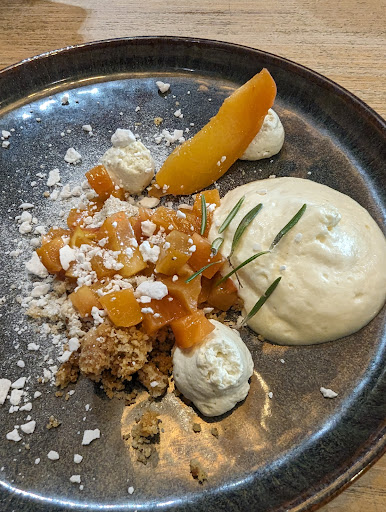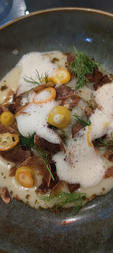 Un lieu atypique en plein milieu d'une rue de Villeurbanne où il ne se passe pas grand chose. La devanture nous interpelle déjà au prime abord avec sa belle couleur bleu Majorelle. Passée la porte, on entre dans un vaste espace avec une très grande salle qui s'ouvre sur une terrasse encore plus grande au fond. Ce jour le temps n'était pas terrible mais les beaux jours la terrasse doit être bien agréable ! Le service est très sympa, sans chichis, les propriétaires tutoient facilement et sont très souriants. La carte est courte et varié chaque semaine, ce qui est parfait. La cuisine est de style bistronomique : betterave fumée, veau tranché finement avec des associations de noisette et herbes variées, tiramisu version citron, etc. Tout est bien assaisonné et les saveurs sont présentes. On a du frais, du croquant, de l'acide et du relevé dans les assiettes. Belle sélection de vins à noter aussi. Menu à l'ardoise seulement le midi, ambiance plus apéro planchas le soir. Une belle adresse où il fait bon vivre et qui doit être bien agréable les soirs d'été...