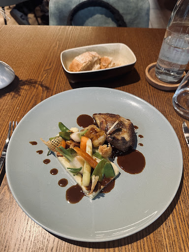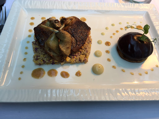 The meat (pigeon) was supposed to be rare but it was medium...it also was not seasoned very well. The garlic dots tasted like raw garlic...not good. Everything else on the plate was just okay and under seasoned.