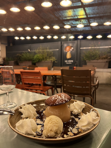 Je souhaiterais juste m’exprimer sur la « décoration » et la DA du restaurant qui m’a vraiment scotché sur place. Un mélange de musée au cochon, des tableaux digne du film le Père Noël est une ordure (qui donne plus envie de devenir végétarien que d’en consommer), le tout accompagné de « bidon d’essence », de plaque de station d’essence, de pneu, du bonhomme Michelin. Puis soudain, un peu de Gainsbourg également. Une question persiste : pourquoi le restaurant s’appelle t-il « le cèpe » ? En effet, j’ai cru apercevoir rapidement une affiche de champignon perdu au milieu des porcs, mais je pensais au moins retrouver plusieurs plats en contenant. Vraiment juste pour l’aspect intérieur du restaurant je serais incapable de revenir. J’entends que c’est un « bouchon lyonnais », mais la décoration était vraiment sans queue ni tête et absolument pas agréable. Sans parler de la nappe du boucher et des sets de table en papier.