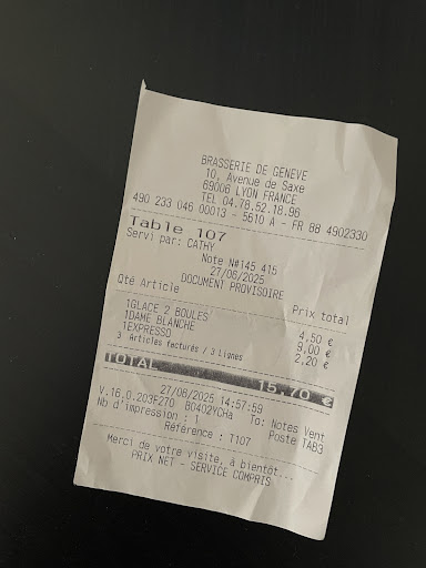 Read moreJ'ai eu la malchance de venir un jour de fête des lumières. On vous donne une carte avec indique "menu" erreur. Quand vous demandez si un menu est disponible, le serveur repond qu il ne sait pas. Je commande un plat, saucisson chaud pommes vapeurs. Arrive une assiette tres vide, 1 cm d epaisseur pour le saucisson, et une pomme de terre en rondelle meme pas entiere. 23€. On dirait une entree. Je le dis au serveur qui me dit de prendre un dessert dans ce cas. Il part 2 fois puis me dit qu'il n y a pas de carte. Il me donne le choix par oral. Je redemande si on peut faire un menu ou une formule. Il bredouille un oui. Amene un dessert correct dont je n'ai pas vu le prix. Arrive l'addition, la dame ne demande pas si tout c est bien passé, evidemment. Tout facturé a la carte 40€. (Avec 25cl d eau) On sort de table avec la faim. Le plat a 23€ en photo, je considere que c'est du vol la. Inadmissible. Le café de Geneve a aussi les prix de la ville eponyme. A fuire...