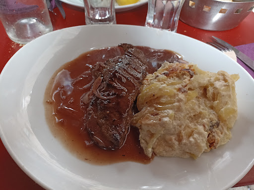 Read moreFor the really low price for the set, I really did not set my expectations up high. I would like to say that the food was below average, but considering the price it's somewhat reasonable, I guess. However, since we just ate at a nice French restaurant the day before (admittedly where a main dish costs more than the cheapest set menu here, I was somehow felt a bit let down after this place. But it's probably more of my fault! Anyways, we ordered two sets and were unable to finish anything given. The onion soup tasted sour with too many pieces of bread in it. The steak was below what you'd find at Asian street markets. The best part about the duck (?) was the dauphinoise potatoes below it, which was probably the best made thing here. The profiteroles were dried ones from the supermarket (I guess deep down I naively thought they would be freshly made), and likewise with the ice cream which had a very cheap texture and flavor. It's a classic case of getting what you paid for. If you do decide to eat here, go for the more expensive set menus or something a la carte. The stuff I see on other tables seem to be much more dignified. For the restaurant, perhaps they could get rid of the lowest-end set menu? Also, the lady who seemed to be the manager seemed very... sad? :( the waiters were all very...