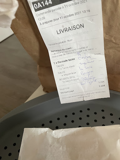 Le tacos est degueulasse et fade : ils se trompent sur la sauce plusieurs fois , les ognons pas cuits. Je suis un client régulier très déçu . En effet , j’ai commandé deux formules tacos + fritte + boisson pour 22 euros . Au final je me retrouve avec un sac sans fritte et ni serviette et des tacos à la vite fait ... le temps d’attente pour la livraison est catastrophique : je commande depuis 19h45 ok , j’appelle à 20h20 le maxi tacos qui me dit « il est sur la route , il arrive dans 5 minutes .., puis 20 h55 je rappel pour savoir combien de temps « on me dit d’attendre 15 minutes ‘’, le livreur arrive à 21h25 soit 1 h25 d’attente pour manger bref la catastrophe a toute les étages . De plus , je rappel le livreur car il manque les frittes ... il me réponds j’ai trop de livraison , rappel la prochaine fois et dit moi que je te dois des frittes ... non mais le client paie à ce que je sache et de plus ce mini tacos nous a offert le pire repas avec un tacos fade et un ongle dedans wesh on est ou ? .c’est la dernière fois que je commande ici à fuir !! De plus, le propriétaire n’accepte pas les critiques fondées et te laisse un message sur le répondeur comme quoi un commentaire à la con ‘’ ? et par contre j’ai oublié aussi un soir ou la honte de votre vie , vous n’avez pas eu de terminal de paiement et j’ai retiré de l’espèce à l’extérieur et le livreur comme d’habitude avait du retard de plus de 40 minutes , quel honte ! ! A fuir de suite . Avant de penser à refaire votre site internet, il faut déjà penser à votre service client le plus important...