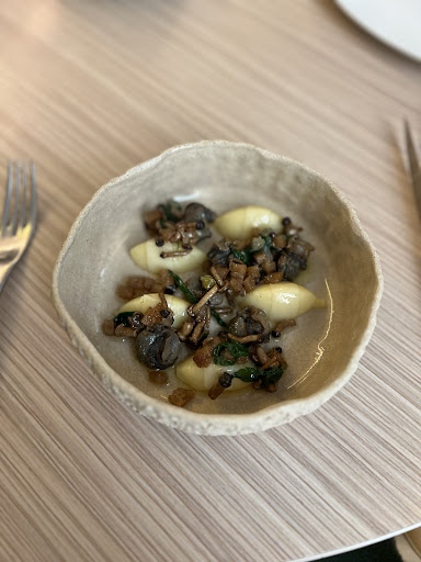 Rice mousse - smooth like yogurt texture, ricey, hint of onion Sardine yogurt tarragon - nice sardine taste with light fried thin puff Quail egg - nice warm egg had hints of fish taste Crab tartine with uni - fresh, sweet, bergamot foam but not memorable as we have kani at home; bread was airy, good crust, but the grain on it distracted from the bread taste Gnocchi smelled like brown butter but was not overpowering. It was very soft mashed with small slice of cheese on top. Vegetable mushroom medley had nice salt and acidity Scallop with egg white and black truffle was ok; scallop could've been cooked better, didn't care too much about the overall flavors and it had very soft on soft texture so we were hoping for some crunch with it Char cooked in beeswax - super interesting method of cooking and the fish was really soft. lemon butter was pretty but the taste was whatever; artichoke had a almost soy sauce glaze was tasty but we didn't think it paired well with fish Australian wagyu was tasty but fatty. Jus had gamey taste. Strange to have a single lettuce on plate. Celeriac was tasty, cooked perfectly; green sauce was celeriac had slight grassy taste Mango yogurt had a cheese like smell but was fine; vanilla peach had a stink like canned peaches Chestnut cake was great, loved the chestnut paste didn't care about the crust Clementine Pannacotta disappointing like a la croix of clementine Pannacotta. Lemon Sorbet way too tart with the lemon rind and kumquat; the piece of date didn't save it Petit four each had their unique flavors; the bonbon had liqueur inside but cracked instantly in mouth very memorable. Chantilly cake had nice egg tasting crust with rum raisins. Overall we were very full and it was an experience but none of the dishes...