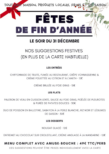 Au niveau du service... Le menu classique était posé sur la table à notre arrivée mais il a fallu 45 min pour avoir le menu du réveillon et la carte des boissons. C'était l'anarchie en salle, les serveuses ne savaient pas quelle table avait commandé quels plats, ni même s'ils étaient à l'entrée ou au plat... Le chef essayait de rattraper la situation en se baladant en salle avec des apéritifs et des amuse-gueules, en demandant "Qui n'a pas eu son apéritif ?"... Nous avons fini par avoir l'apéritif puis nos verres de vin (en les réclamant à nouveau), puis l'entrée est arrivée, avant les amuse-bouche. Pas de pain, obligé de se lever pour aller le demander. Mon conjoint commande un 2e verre de vin, la serveuse nous enlève nos 2 verres, y compris le mien qui était encore à moitié plein... Je la rattrape à temps mais elle avait déjà mis les doigts dedans... Les serveuses étaient toutefois sympathiques bien qu'incompétentes...
