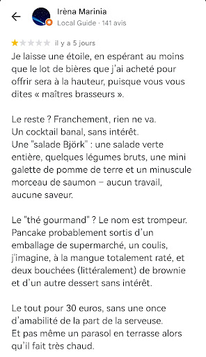 J’étais pourtant accompagnée d’une amie fidèle de votre établissement — le mot fidèle étant désormais à conjuguer au passé. J’ai offert vos bières dans un esprit de partage, pensant sincèrement faire plaisir. Résultat : la personne à qui je les ai offertes a été choquée par le ton méprisant de votre réponse, au point d’envisager de vous les rapporter…