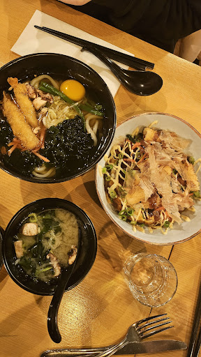 We started with a Japanese koshu to drink, then ordered a bit of everything: chicken karaage, okonomiyaki, sushi, plus my friends got a bento box and ramen, while I went for the udon. The food came out fast, super fresh, and full of flavor. The chicken karaage was honestly the best chicken I’ve ever tasted—so crispy and juicy. All the main dishes were perfectly seasoned, with generous portions and tons of fresh ingredients.