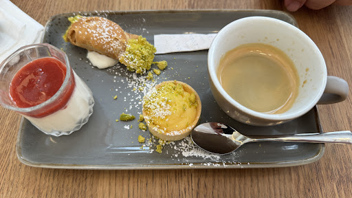 âââââ Des cannoli Ă la pistache exceptionnels ! Un dessert qui mĂ©rite le dĂ©tour : J'ai eu le plaisir de dĂ©guster ces magnifiques cannoli Ă la pistache et je dois dire que la prĂ©sentation Ă©tait dĂ©jĂ un rĂ©gal pour les yeux ! Trois petits chefs-d'Ćuvre dorĂ©s, dĂ©licatement saupoudrĂ©s de sucre glace, accompagnĂ©s d'une Ă©lĂ©gante quenelle de crĂšme. QualitĂ© et saveurs : La pĂąte des cannoli Ă©tait parfaitement croustillante, avec cette texture si particuliĂšre qui craque sous la dent. La garniture Ă la pistache Ă©tait gĂ©nĂ©reuse et authentique - on sent vraiment le goĂ»t franc de la pistache sicilienne. L'Ă©quilibre entre le croquant de la pĂąte et la douceur crĂ©meuse de la garniture Ă©tait parfait. PrĂ©sentation soignĂ©e : La prĂ©sentation sur cette belle assiette en grĂšs, avec le sucre glace artistiquement rĂ©parti, tĂ©moigne du soin apportĂ© mĂȘme aux dĂ©tails. C'est le genre de dessert qu'on a envie de photographier avant de le dĂ©guster ! Mon avis : Ces cannoli rivalisent avec les meilleurs que j'ai pu goĂ»ter. Pour les amateurs de pĂątisserie italienne authentique, c'est un incontournable. Je reviendrai sans hĂ©siter pour dĂ©couvrir le reste de la carte ! Recommandation : Parfait pour finir un repas en beautĂ© ou pour accompagner un bon...