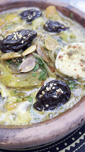 Présentation: Belle. Le tajine a été servi très chaud. J’ai trouvé original le fait d’avoir placé des petites graines de sésame sur les 6 pruneaux. Les 6 pruneaux ont été distribués uniformément dans le tajine dont un au centre sur la viande qui fait aussi office de siège pour des émincés d’amandes grillées. Un œuf coupé en 2, assaisonné par du cumin et du paprika. L’espace restant est comblé par une sauce bien fournie, des tranches d’oignons, de carottes, des olives énucléés et des petites herbes. La quantité de viande agneau est très importante.