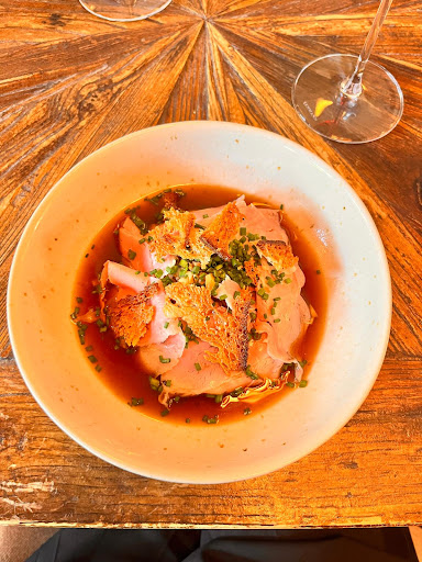 We had pate en croute and the crème mushrooms with broth. Both incredible but the mushrooms were bursting with flavor and the broth just brought that extra touch of skill to elevate the dish. We both had the pork for mains. I’d order this time and time again. Pork was perfect, the candied tomatoes and crispy onions were revelations. Bringing texture and sweetness to the dish. Best dish I’ve had in a while.