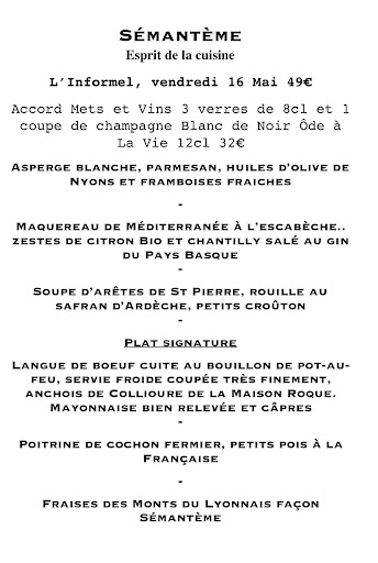 Nous avons dîné chez Sémantème un soir de menu unique, et ce fut un sans faute du début à la fin. Des assiettes élégamment dressées, une cuisine française raffinée, 100 % faite maison, avec des produits de saison parfaitement travaillés. L’accord mets-vins était très réussi, avec des choix originaux et cohérents qui accompagnaient parfaitement la dégustation. Les apéritifs, issus de petits producteurs, étaient aussi absolument bluffants.