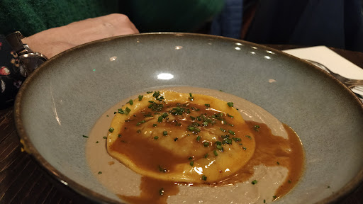 Found this in the Michelin app. Did not disappoint. The decor is modern and simple, not many tables, 10 including outside seatings, Cody but not too tight space between tables. Herring terrine dressed with so many vegetable ingredients in the plate that making it complex but so many flavors and texture working so well together. Wow. What is great for me if the garnish, how many ingredients it takes to make it. Second was filet mignon with brown sauce. It was served with roasted eggplant was made in two ways, changing the texture and taste. The Roquefort sauce was served on the side on case you prefer it. The apricot roasted with caramel and ice cream. Simple but heavenly. One of the best meals on Lyon. Worth the return.