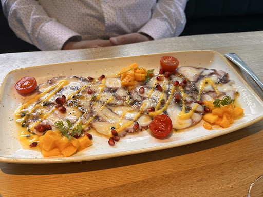 Le carpaccio de poulpe de roche, d’une fraîcheur à faire rougir les marées méditerranéennes, nous a transportés, en une bouchée, sur les rivages ensoleillés de Sète, où les vagues semblent murmurer des poèmes salés. La pizza quatre fromages, quant à elle, est une symphonie fromagère si parfaitement orchestrée qu’elle pourrait faire pâlir d’envie les pizzaiolos de Naples – un chef-d’œuvre croustillant, digne d’une standing ovation. Et que dire du saumon mi-cuit, paré de sa croûte de sésame, accompagné de son écrin d’avocat velouté et de piquillos éclatants ? Ce plat, d’une harmonie presque insolente, est une célébration de la fraîcheur, comme si la nature elle-même avait décidé de collaborer avec votre chef pour charmer nos palais.