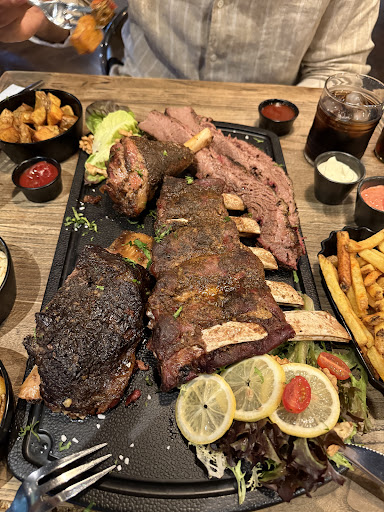 Went for lunch on a Saturday after hearing about this place. In Canada we have lots of smoked meat options but not so much in France so we were excited to try! Honest review here, the food is insanely delicious, really. The little appetizer buffet is so good with the best hummus I've had in France! The orders came quickly, we ordered brisket w fries and short rib w potatoes. The fries + potatoes had a little spice on them, so yummy! The meat was literally fall off the bone and the brisket juicy and fresh, huge portions which was great to enjoy the next day. Only thing I would say is that the service once our meal was done is very slow making it so we didn't bother getting coffee and dessert which is too bad cause I really wanted to try their desserts. That's an easy fix and really would not stop me from coming back. The food speaks for itself, I would definitely recommend this for a meat eater!! I look forward to coming back and testing the other items...