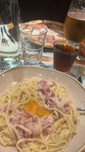 Dommage… c’est bien la première fois que je suis déçue en sortant d’un Del Arte. Étant une fan inconditionnelle de pâtes carbonara (les fausses et les vraies ahah), j’ai été stupéfaite de voir beaucoup beaucoup de crème. Alors que la crème n’est pas utilisée en grande quantité dans les autres Del Arte (chez les autres la sauce était plus crémeuse, plus compacte). La sauce avait un goût d’eau, même en rajoutant sel, parmesan et poivre, toujours fade. La viande utilisée n’était pas la bonne, normalement c’est de la pancetta et là c’était du lard en tranches tout juste cuit… De plus, nous avions commandé une pizzetta, nous avons reçu une pizza classique. La pizza étant déjà cuite et servie devant nous, je trouvais ça mal poli de faire retourner le plat. Autrement, la serveuse qui était en salle, adorable (oui malgré la petite erreur sur la pizzetta). J’espère que c’était un loupé pour les pâtes et que ce n’est pas la recette qui est servie tous les jours… (Pour répondre à votre commentaire, ci-joint la différence entre votre soit disant pancetta et la vraie recette del arte d’un autre restaurant. Il faudrait apprendre à différencier les différents morceaux du porc. De plus, je n’ai jamais dit que la serveuse avait fait du mauvais travail ou une erreur monstrueuse. Juste je signale et je...