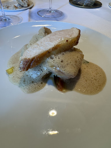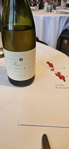 Se garer sur la petite place du village et entrevoir la vue sur les vignes de Pouilly-Fuissé et autres Mâcon locaux… Attention, avant de venir et pour ne pas critiquer ensuite, il faut comprendre le principe de l’établissement. Et se préparer à vivre un repas « à l’ancienne » qui durera dans mon cas 3 bonnes heures. Ceci posé, c’est parti ! Salle de taille modeste joliment décorée. La patronne est une personne dont j’ai particulièrement apprécié la gentillesse discrète et la conversation en toute simplicité. Réservation obligatoire et menu unique. Mises en bouches hautement travaillées sur le fond et la forme, foie gras sublimé dans un mélange surprenant, quenelle de brochet aux écrevisses, trompettes de la mort et bien d’autres ingrédients (lire les lignes du menu pour un aperçu alléchant). Pour le deuxième plat, eu le choix entre cotes de veau et colvert. Puis chariot de fromages, puis un fabuleux feu d’artifice de mignardises délivré petit à petit et dont on se demande s’il finira. Grand choix de vins locaux ou régionaux de grande qualité. Étoile du guide parfaitement méritée. Un moment qui pour ma part ne sera pas près...