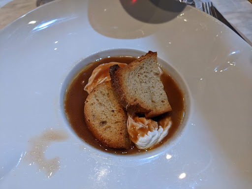prezzo speso 47,00 euro. Posizione sulla strada principale, buono per chi è a passeggio più difficile arrivare in auto non essendoci parcheggio adiacente. Locale con tavoli all'esterno, noi abbiamo mangiato dentro. Locale con arredi classici un po' storici, la nostra posizione davanti al bancone del bar nel passaggio anche se il locale era vuoto al nostro arrivo. Tavoli piccoli per due persone. Tovaglia un un foglio di carta, tovaglioli di carta cestino del pane in vimini stile pranzo al bar sotto casa. Pane industriale una sola varietà piuttosto gommoso. La zia zuppa di pesce gustosa servita in una ciotola con a lato due ciotole con formaggio e una con una salsa molto buona da cospargere sui 4 crostini di pane. Zuppa buona voto 4 su 5. Secondo una fetta di carne in salsa di cipolle. La carne era immangiabile, forse la prima volta che lascio una pietanza nel piatto. Approcciata da tutti i lati e in tutti i versi non era possibile tagliarla tanto meno masticarla ho dovuto rinunciare. La cameriera ha notato, le abbiamo segnalato la cosa, non ha dato alcun cenno di preoccupazione o di interessamento al mio disagio. Voto 0 su 5. Dolci, i dolci presumo non preparati da loro, ma industriali, ho preso una mousse al cioccolato discreta ma molto nauseante. Servizio molto massivo senza cura dei commensali, non un ristorante di prestigio. Vini si parte da mezzo litro sfuso a 10 euro...... Quindi 20 euro a litro lo sfuso. A casa mia con 20 euro si beve del Barolo docg in bottiglia di qualità. Mi sono tolto la fame con le patate fritte a contorno della carne. La mia cena vista in altra ottica è stata... Un minestrone, una bistecca dura con patate fritte, e un dolce industriale,.. Nel passaggio davanti ad un banco di servizio.. A pranzo di lavoro un servizio così lo pago 10 euro con mezzo litro di vino e caffè compreso. Qui senza vino ne caffè lo stesso menu pagato 20 euro..e avanzato la carne. Per me da evitare. Meglio un...