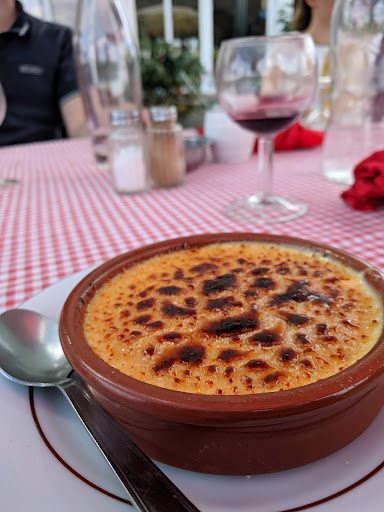 One of those necessary restaurants that isn't a real restaurant to serve the hotel visitors or because it's in between beginning and end destination. Run down, old umbrellas protect from the glaring sun outside gives a feeling of visiting a family member's patio to join them for a friendly lunch. One main course was home made, the chivet lapin with red sauce and white flour, had ample mounds of tender rabbit. The roti chicken was dry and old with some golden broth, and the scraggly cat appreciated any morsel. Repeatedly reheated potatoes were served on the side. Gesier of duck consisted of dry dark chunks on old salad (presumably opened from a plastic bag) was tough to stomach. Even the cat gave a typical French nose snub to it . Rubbery shrimp on promising fresh slices of avocado with in-season tomato slices was a pleasant respite. Confit duck was dry and unappetizing. Didn't offer it to the cat. French fries saved the day! Creme brulee was days old and sugar...