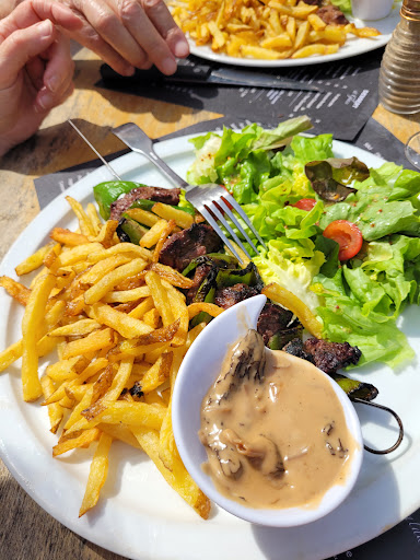 Et les plats regardez mes photos . Mes enfants ont pris des pizzas elles étaient délicieuses avec une pâte très bonne .... la brochette de boeuf accompagnée de frites délicieuse et de la sauce aux morilles mummmm miam miam .....mon steak tartare était vraiment bon ...