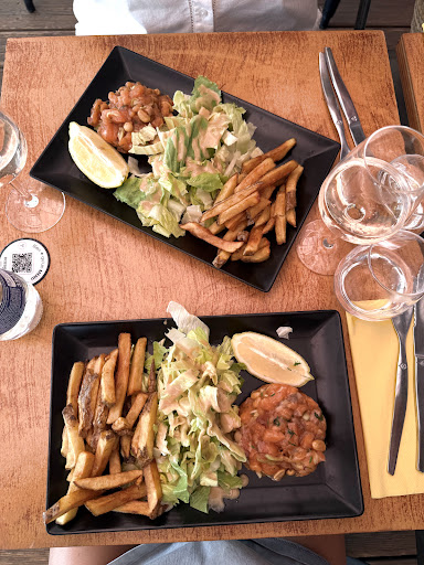 Le service a été plutôt rapide et l’équipe agréable, rien à redire à ce niveau. En revanche, nous avons été vraiment déçus par les plats, au point de laisser environ 80 % de nos assiettes sur la table. Nous avions commandé : • Tartare de saumon avec riz et frites : le tartare était noyé dans la sauce soja et beaucoup trop poivré, le riz était dur, et les frites excessivement grasses. • Linguine aux gambas : des pâtes très chargées en ail et en persillade, avec des gambas au goût amer, pas assez cuites ou mal décongelées. • Dorade avec légumes et frites : dorade correcte, mais les légumes sans saveur et les frites à nouveau trop grasses.