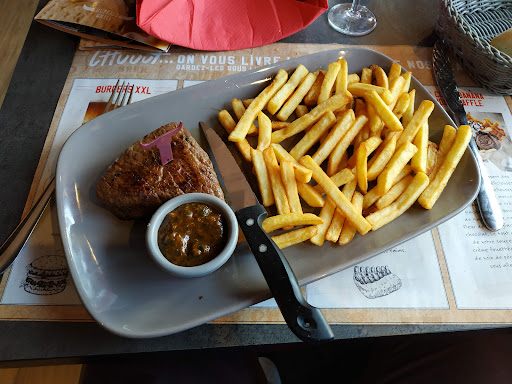 It's probably not an ideal location, situated in an industrial area nestled behind a business and a Best Western Hotel, but it seems to do OK. I visited on a Thursday night, quite early, and it was busy enough to warrant a live band (which started to play at 8pm). There's plenty of parking at the front of the restaurant, and dogs are allowed inside....so extra points for that. The restaurant inside is spacious, containing many tables with different types of seating (chairs or padded booth seats) and has different sections. I was located in a section separate from where the band was playing. Overall, it had a nice atmosphere. I was greeted by a friendly waitress who, lucky for me, spoke some English (I unfortunately only know very little French). She was patient enough as I struggled to interpret the menu (only in French)....which is quite large and doesn't include the dessert section (that's on the table as a placemat... and lots of options, too). Whilst I endeavoured to interpret the menu, the waitress brought out complimentary bread rolls (warmed, but rock hard) and a tiny bowl of salad (consisting mostly of lettuce leaves). For entrees, I ordered 8x onion rings. These were nice but were only accompanied by a tiny bowl (thimble) of BBQ sauce...a bit expensive for the portion. For the main fare, I ordered the XXL Caramelised Pork Ribs. These were tender, but lacking the caramelised taste and more like a charcoal taste....again the accompanied sauce portion was woefully inadequate. Furthermore, the ribs could've been served hotter, as the portion on the bottom was quite cool. I think they need to heat up the plates, as I believe this was the cause of the low temperature. The French Fries that came with the dish were quite nice but were unsalted. The price would've been justified had the dish...