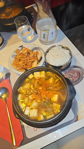 De passage à Marseille pour un wk prolongé, ma fille et moi avions envie de manger coréen... On tente alors ce resto coréen au vu des bons avis. Déjà, impossible de les joindre au tél, je dois réserver en passant par une appli. Arrivées sur place, accueil expéditif mais vérification que vous avez bien réservé :-( Nous commandons 1 menu bbq bœuf, une galette de kimchi et des nouilles sautées (japchae que la serveuse ne comprend pas...) et 2 cocktails. Nous sommes servis assez rapidement, le japchae et la galette de kimchi sont bons rien à redire. Pour le menu bbq bœuf, la viande est correcte et bien marinée... Par contre les accompagnements (banchan) sont franchement mauvais ! Champignons noirs et brocolis n'ont aucun assaisonnement donc aucune saveur, le kimchi est fade et mou... Et le riz, ce n'est pas du riz type coréen qui est servi mais du riz thaï... Cela ne convient pas au niveau des saveurs et en + il était trop sec et compact :-( Enfin les cocktails étaient quelconques (brochette de bonbons archi sèche)... Les serveurs étaient complètement débordés et la salle très enfumée par les bbq des clients. Bref, une petite déception pour ce resto... Grands amateurs de cuisine coréenne je ne vous le...