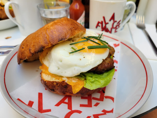 Fantastic brunch options, excellent service, great street cafe vibe. As Americans living in France we relish the opportunity to find breakfast/brunch that reminds us of home and La Fiancée delivers one of the best brunch experiences in France. Fantastic buttermilk (good luck finding this anywhere in France) pancakes with excellent thick, whipped cream, toasted hazelnuts, sliced fruit and maple syrup. I am a pancake snob and these were incredible. Light, fluffy, flavorful. Cant recommend highly enough. Also had the Breakfast Bun- well cooked egg with cheese, crisp/sweet lettuce and a sausage patty ( also rare in France) on a delicious, savory bun. Perfect combination of an American standard executed with delicious French food and French cuisine perfection.