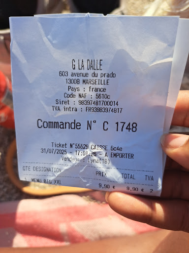 Read moreExpérience décevante lors de ma visite du 20 septembre 2025 à G LA DALLE de Prado 13008 Bonjour, Je tiens à partager ma déception concernant ma récente visite dans votre établissement le 20 septembre 2025, à 14h. J'ai pris un menu enfant (nuggets et frites) et un menu avocat. Malheureusement, l'expérience n'a pas été à la hauteur de mes attentes. Tout d'abord, le menu enfant était censé être composé de nuggets, mais l'un d'eux contenait un os à l'intérieur, ce qui aurait pu entraîner un accident grave. Heureusement, mon enfant l'a vomi immédiatement, mais cela reste un incident préoccupant. Ensuite, concernant le menu avocat, il n'y avait tout simplement pas d'avocat dans le plat. Ce dernier était totalement différent de ce qui était annoncé. Lorsque j'ai exprimé mon mécontentement auprès de la caissière, celle-ci m'a répondu, avec un sang-froid qui m'a étonné, que les nuggets sont fournis tels quels et que l'hamburger ne correspondait pas à la photo, mais qu'il y avait une sauce avocat. Cela ne justifie en rien le fait qu'il n'y ait pas d'avocat dans le menu, ni la présence d'un os dans le nugget. Je trouve que ce genre de situation n'est pas acceptable, surtout en ce qui concerne la sécurité alimentaire de nos enfants. J'espère que vous prendrez ces remarques en considération pour améliorer la qualité de vos produits...