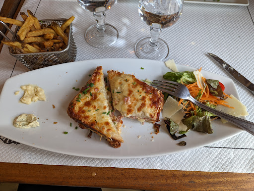 We happened to just be walking past when we decided to stop for lunch. One of the service personnel was in the doorway and sat us inside immediately. I had the daily special of croque monsieur. It was truly excellent. Crispy in all the right places and melty and delicious inside. It came with a side salad and fries. The salad was standard, good but I'm not a salad person. The fries were perfect, especially with the homemade mayonnaise and the homemade house sauce. The house sauce was probably a mayonnaise or aioli base and had garlic and some herbs in it. We also ordered dessert. The chocolate cake was divine. Warm and gooey with a perfect scoop of vanilla ice cream. I would...