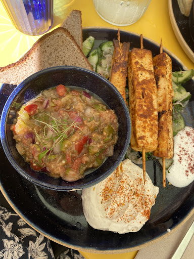 And the food was perfect, too: We had a delicious bowl with aubergine and cucumber salad, different really creamy sauces and grilled tofu skewers which were crispy on the outside and soft inside. My gluten free bread has been perfectly toasted! It was the perfect combination of fresh and filling food 🤤 The sizes are also quite big. The homemade almond-milk and coffee-shot in my Chaï Latte was a combination which I haven’t seen/drank in other places before.