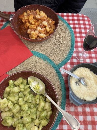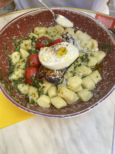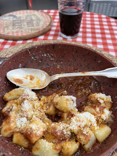 A l’intérieur c’est petit et c’est bruyant. Un « vrai » italien est planté là à l’entrée en train de rouler des gnocchis pour faire croire que l’endroit est authentique. A l’extérieur ben on est dans la rue les gens nous passent à côté en permanence c’est bruyant aussi mais c’est mieux que dedans. Mais bref le problème c’est 1) la nourriture. Gnocchis très peu nombreux et tout mous, baignant dans l’huile et l’ail cru (désastreux niveau digestion), tomates soit disant rôties sont en fait au nombre de quatre et vaguement tièdes passées au micro ondes et pas un brin cuites. Une burrata ok mais bien sûr on la coupe en deux sinon c’est pas assez rentable. Le morceau d’aubergine rôtie est microscopique. Le tout servi dans une vieille poêle cabossée et rouillée pour « faire authentique » (pour pas faire la vaisselle oui…) et voilà ça fera 20 euros ! Preuve de tout ce que j’avance en photo. Mais ce n’est pas fini. Problème numéro 2. Nous sommes deux à déjeuner et au moment de payer il y a une grosse erreur de caisse. Au lieu d’un café le patron en encaisse quatre. Il a voulu nous entuber, clairement sur le ticket le « 1 » ne ressemble pas à un 4 et je veux dire, à quel moment 2 personnes prennent 4 cafés ? Je lui fais remarquer il ne s’excuse nullement, commence à râler. Ayant vécu un très mauvais repas j’ai l’outrecuidance de lui partager mes impressions. Il monte en pression. Il n’est de toute évidence pas dans son état normal. Je lui dis qu’erreur de caisse ou non de toute façon ce qu’on a consommé ne vaut pas ce que ça nous coûte. Il ne commence pas à crier et à me tutoyer ? « EH BEN CASSE TOI !!! DÉGAGE !!! » Je lui ai dit que c’était bien mon intention et que je n’avais pas besoin qu’il me le demande. Les serveurs vraisemblablement habitués à ses coups de sang me disent de ne pas faire attention, ils s’excusent. Donc voilà mon avis Valentin : calme le parmesan dans les narines. Trouve un autre job, tu n’as pas la carrure pour gérer un restaurant. Je souhaite à tous les serveurs de trouver autre chose loin de ce tyran. Et aux futurs clients : passez votre chemin, c’est cher, c’est mauvais, c’est la mode pour quelques semaines et ça finira par couler comme ça mérite. Très très...