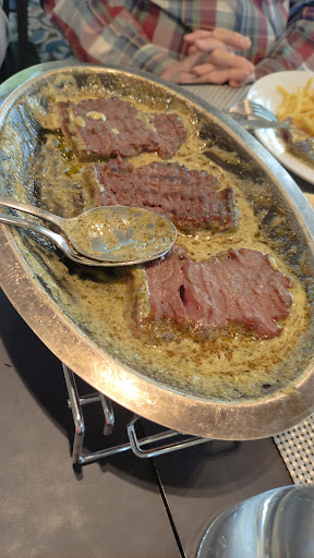 On est censé être dans un restaurant de viande « et nous mangions les viandes avec des couteaux de cantine » et on a dû demander des couteaux plus tranchants. Les frites ne sont pas faites maison et étaient molles.