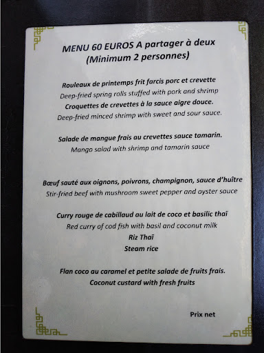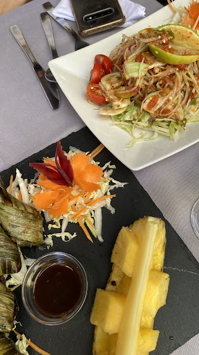 Nous y avons déjeuné en couple jeudi 5/08/2021. Nous avons retrouvé avec plaisir, Lat, la patronne, toujours aussi accueillante, souriante, malgré l'affluence de clients ce jour... Installés en terrasse, à l'ombre, moment de détente et d'évasion... Nous avons chois le menu à 65 € pour deux personnes. Rouleaux de printemps frits farcis porc et crevette; soufflé de crevette au lait de coco à la vapeur dans feuille de bananier; salade de poulet grillé, tomate, poivron, oignon, concombre; boeuf sauté aux oignons, poivrons, champignons; curry rouge de cabillaud au lait de coco et basilic thaï; riz thaï; flan durian au lait de coco, crème anglaise et crème coco. Tout est délicieux, de l'entrée au dessert, c'est copieux et très bien présenté, beaucoup de goût, festival de parfums, c'est un régal. Un vin rosé, côteaux d'Aix L'Embassadeur, parfait pour accompagner ce repas. Merci à Lat, pour sa gentillesse, merci au cuisinier pour ce voyage. Nous y avons déjeuné en couple mardi 4/08/2020. Accueil toujours aussi chaleureux de la patronne, nous sommes contents de la revoir et de constater qu'elle a pu faire ce qu'il faut pour ouvrir à nouveau son restaurant malgré la crise sanitaire et les problèmes de trésorerie associés. Elle nous a installés sur la terrasse bien ombragée, ambiance, détente, calme. Serviettes en coton et non en papier ! Nous avons choisi le menu à 60 € pour deux. Je ne détaillerai pas le menu (photo jointe), je dirai seulement que tout est parfaitement préparé, très bien présenté, c'est une une promenade gustative...nous avons juste demandé du piment thaïlandais pour relever davantage les plats, nous apprécions. Non seulement tout est très bon, mais en plus c'est copieux! Un rosé côtes de Provence Tentation en apéro et pour accompagner ce repas, excellent lui aussi. Merci au patron en cuisine et à la patronne en salle. Le service est impeccable, la patronne et les serveuses sont très attentives et attentionnées. Excellent rapport...