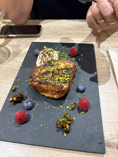 Nous avons également pris le pain perdu en dessert (17 €). Il était excellent, vraiment délicieux, mais la portion était minuscule : un petit morceau de pain et 4-5 fruits rouges seulement. Honnêtement, même si la qualité est là, j’ai trouvé les prix globalement trop élevés, au moins 5 € de plus par plat compte tenu de...