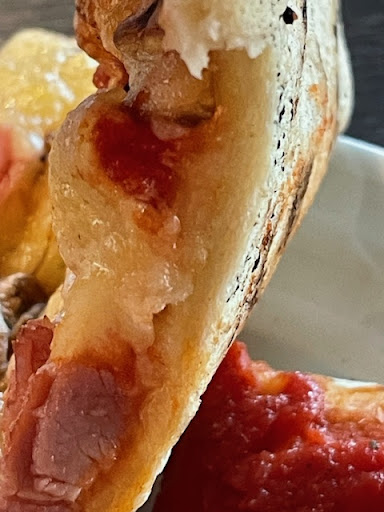 The first, a mushroom, onion & ham pizza was flavor-wise OK, but the dough was undercooked (see photo).