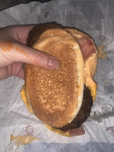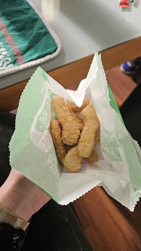 6/ 28 minutes après notre première commande, le moment tant attendu de la dégustation ! Assis au milieu de tables remplies de personnes se plaignant des mêmes choses que nous et d'à quel point c'est honteux, nous avons enfin pu manger ! Le seul point positif (ou du moins pas négatif...) de cette visite sont les frites. Et... c'est tout ! Les sandwichs étaient immondes. Le mien était composé de pain et de sauce en gros, et celui de mon conjoint était vraiment mauvais. Il avait une odeur pestilentielle, la salade était flétrie, la viande à peine mangeable, le bacon (de poulet au passage !) nauséabon.