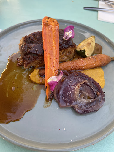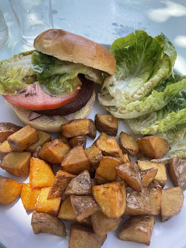 They have vegan options which helped as I was starving and couldn’t find vegan restaurants around (Why are they so limited in France??). Took a seat in the shadow under a tree, was very comfy. Had a burger with a vegan patty (probably made of veggies of different kinds, I cannot say if it was home made or not) some pdt on the side and a salad (which turned out to be five leaves of salad with some oil). I mean I was so happy to have found something vegan and the person working there was super friendly and cute. But maybe for future references, from a vegan perspective, some ketchup (to be fair, I was offered mayonnaise, but it was not vegan) on the burger, a salat with tomatoes and olives… idk… that’ll make it feel more complete, non? Maybe the non-vegan options are more balanced, idk. Otherwise thanks for the hospitality and...