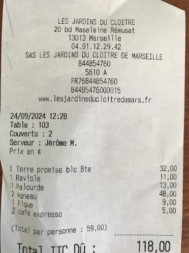 Une très belle soirée! Nous avons bu l apéro a côté du terrain de pétanque, entourés de fleurs et plantes du jardin/potager face à la chapelle au coucher de soleil (ça fait cliché mais c est top 😁). Le personnel était au petit soin. Nous sommes entrés manger à l intérieur du jardin du cloître, lieu magique par excellence ! Raouf, notre serveur était à la fois adorable et très professionnel, de même que les jeunes filles qui venaient nous servir ou voir si tout allait bien. Le brasero (poisson/gambas pour notre part) était divin. Cuisson parfaite, et accompagnements de légumes harmonieux et pleins de saveurs. Nous avons fini par un café gourmand côté jardin extérieur où Raouf est venu nous allumer de petits lampions très romantiques. Dommage que le service communication ne soit pas plus efficace sur ce genre de soirée et que les planches (fromage/charcuterie) à partager ne soient plus d'actualité car c est un excellent spot d'afterwork dans un lieu encore "protégé" du béton dans ce quartier où l'on manque cruellement d'endroits où sortir et partager des moments de convivialité dans un cadre...