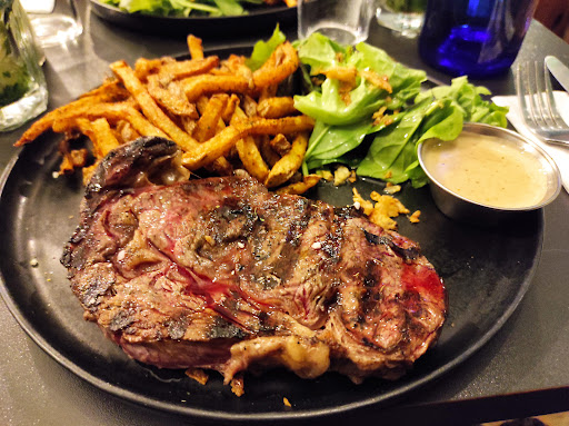 Restaurant fréquenté il y a de nombreuses années quand il s'agissait d'un restaurant Portugais, la décoration a été refaite et l'ambiance est agréable. Un accueil agréable et décontracté puis direction la salle. Nous étions les 1er mais la salle s'est rapidement remplie. Une carte très courte, voir trop à mon goût, tout comme pour le vin. Les appellations sont mentionnés mais pas les domaines. Des entrées correctes, pleines de saveurs. Arrive les plats, ma pauvre bavette a prit chère sur le grill, les belles traces noires qui donnent un goût de brûlé, pas agréable du tout, accompagnée de mini frites molles. L'hamburguer maison semble bien plus réussi. La salle s'étant remplie assez rapidement, le service s'est tendu et nous avons fait le choix de ne pas prendre de dessert pour ne pas attendre trop longtemps.