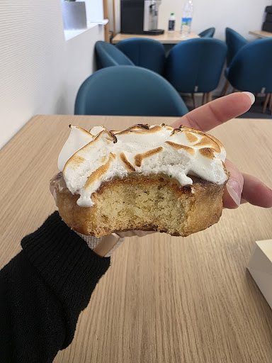 Une découverte, loin de la tartelette citron meringuée conventionnelle, un biscuit très épai ( sensiblement proche du " palet breton" ) composé principalement d'amande, celle-ci nous ramene au mois de janvier et sa galette frangipane. Sur ce biscuit se trouvait une très fine couche de crème citronnée, puis, sur le dessus une meringue flambée venait finir la présentation de cette patisserie.