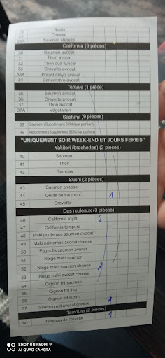 On est arrivé à 12h30 (resto à 2),la prise de commande à été faite à 12h34 ,une erreur à été faite de la part de la serveuse elle est partis avec la feuille de commande du coup on à pas pu vérifier ce que l'on avait prit (elle est censé prendre note et nous laisser la feuille pour les autres service car le service est à table.On c'est fait servir qu'un bol de nouille sur tout notre commande à 12h43, très mal servis par la serveuse presque jeté sur la table(voir photo). Riz au crevette servis à 12h47 avec 5 petits morceaux de crevettes mi-cuite sinon le riz et ces autres accompagnemments sont bon, sushi makis et futomaki servis à 12h50 avec une belle présentation. Saumon dans les makis et sushis assez fade sinon les makis aux avocats au concombre sont bons même si la plupart sont mal fermé. Rien à dire sur les futomaki il y a les même ingrédient que j'ai mentionné précédemment. Fin de la 1ere commande à 13h10, prise de la 2ème commande à 13h14. Arrivé de la 2ème commande à 13h19.pas grand chose à dire sur les Californias à part qu'ils sont assez bon, yakitori boeuf fromage délicieux rien à dire. Un peu d'eau en dessous des Toillettes propre mais papier mal desservie. On a eu pour un total de 27€80 je trouve que c'est chère pour ce que c'est avec un choix limité et des dessert de 2cm cube à 3€ comparé au dragon d'or à sept sort ou il y a + de choix et ou les saveurs sont + fréquente, les desserts la bas sont gratuit. Seul les clients sont polis jusqu'au moment de payer ou il vous dise au...