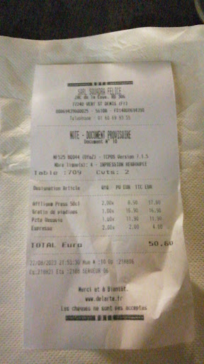 Read moreArrivĂ©s hier midi en dĂ©but de service car Memphis coffee en travaux, et mis dans l'ambiance par l'accueil dĂ©jĂ blasĂ© de la personne qui nous installe (pas un regard, aucun sourire et un "bon appĂ©tit" balancĂ© par obligation, autant ne rien dire). Les apĂ©ritifs arrivĂ©s en milieu de repas, qu'il a fallu rĂ©clamer. Effectivement ils n'avaient plus de sirop de pĂȘche pour le Bellini de mon conjoint donc manifestement, il Ă©tait plus simple de ne le servir ni lui ni moi plutĂŽt que de nous en informer ! Il demande donc un kir Ă la place, son kir arrive et mon italicus n'est toujours pas servi car...ah oui il n'y a plus de sprite!! Quel parcours du combattant pour juste 2 apĂ©ritifs. Nouvelle attente interminable pour qu'on vienne retirer nos assiettes et commander le dessert de notre fils car compris dans le menu, sinon il va s'en dire que nous l'aurions emmener prendre son dessert ailleurs. Pour notre part nous ne prendrons donc ni dessert ni cafĂ© car juste envie de quitter ce restaurant pour ne plus y remettre les pieds. La glace mettra plus de 20 minutes a arriver aprĂšs Ă©videmment avoir dĂ» la rĂ©clamer car elle n'arrivait toujours pas! Passage en caisse avec la mĂȘme charmante personne qui nous a placĂ© et qui a priori n'a toujours pas retrouvĂ©e oĂč elle avait laissĂ© son sourire, certes nous sommes la veille d'halloween mais donner l'impression de vouloir morde chaque client n'est pas une obligation. Pizzas del arte vert saint Denis Ă©tait une premiĂšre pour nous et pour rassurer cette serveuse Ă l'amabilitĂ© en grĂšve, une derniĂšre Ă©galement, ça lui fera toujours 3 clients en moins Ă voir si cela peut lui faire plaisir et la rendre un peu moins aigri (autre option, changer de mĂ©tier si on est pas fait pour le contact avec la...